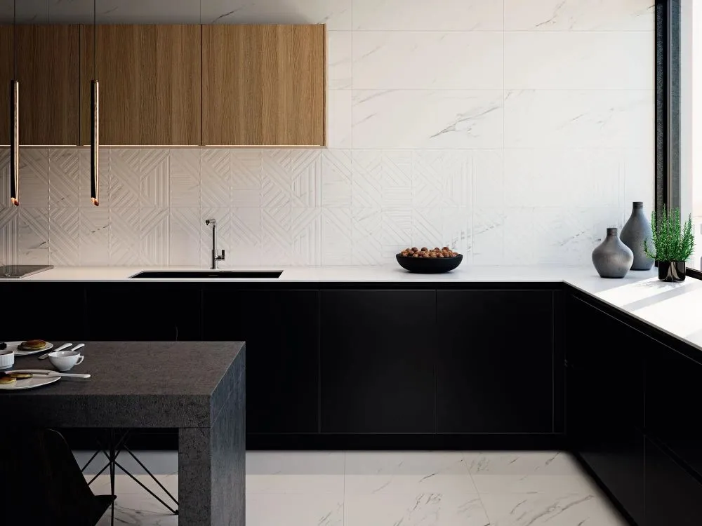 Коллекция Акрос Клик Керамика с рисунком под классический мрамор, и декором с геометрическим узором в формате 35x90 см. Плитку в таком формате рекомендуем укладывать с использованием выравнивающей системы TLS.