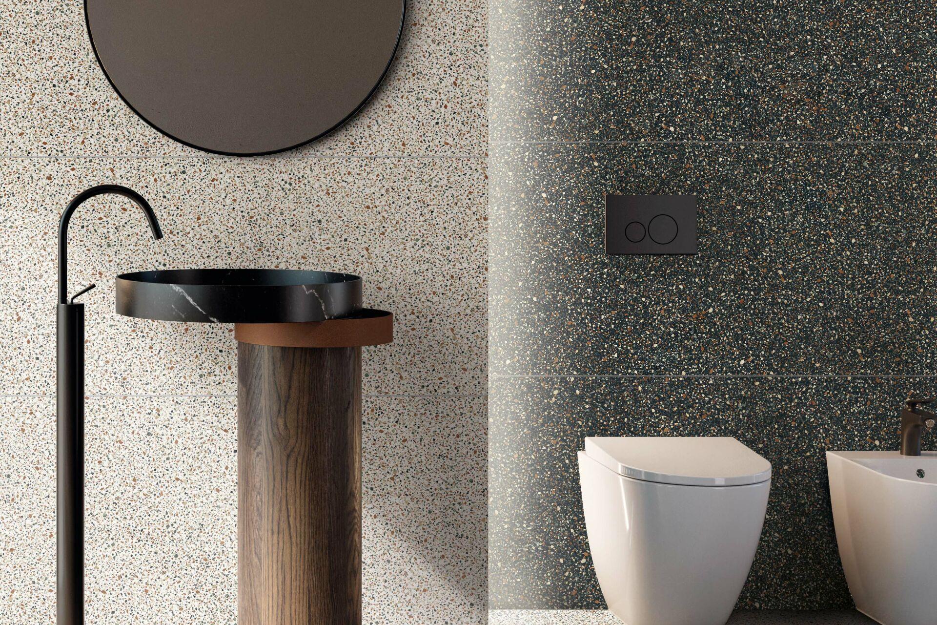 Коллекция Бленд с имитацией терраццо с крупной разноцветной крошкой. Матовая поверхность и универсальная гамма цветом подходит для интерьеров различного назначения.