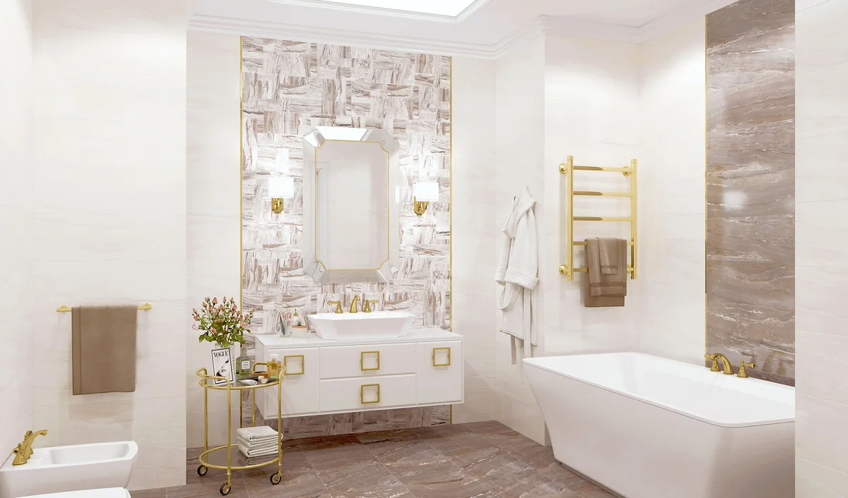 Два благородных контрастирующих оттенка окаменелого дерева для создания интерьера в кремово-кофейных цветах. Boston Antique - плитка в виде декоративного массива из разнонаправленных срезов послужит акцентом коллекции.