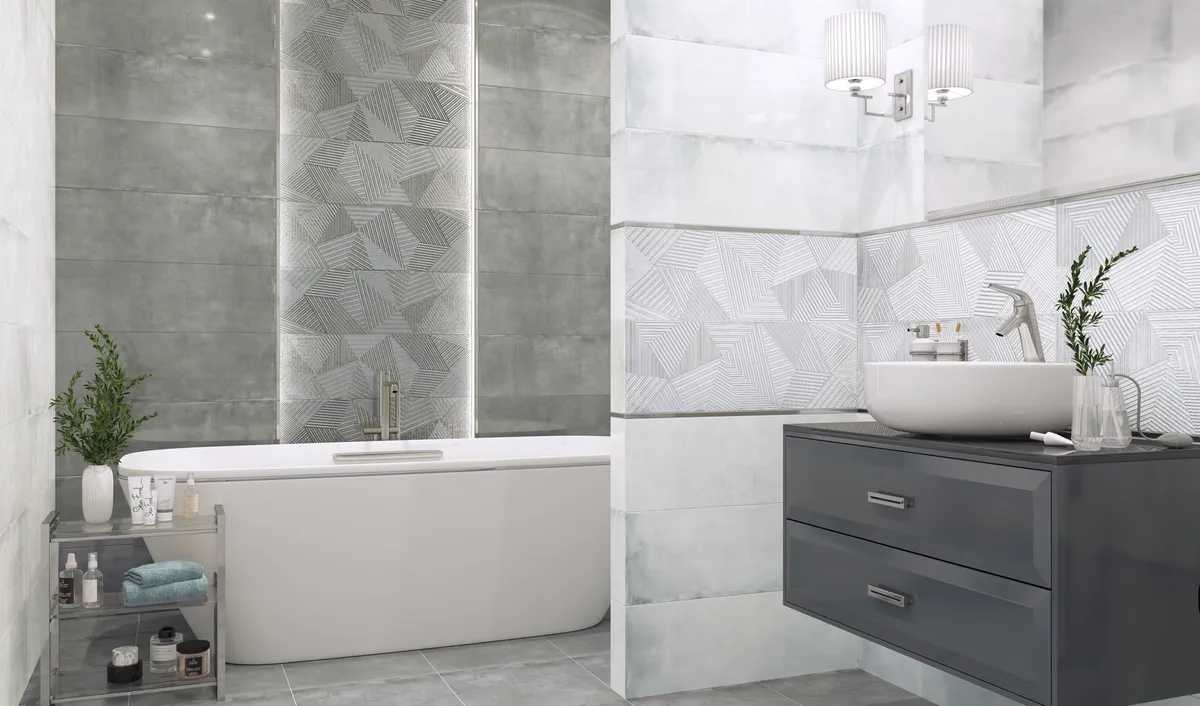 Лофтовое сочетание светло-серых и графитовых оттенков под бетон. Оригинальные геометрические насечки на декорах подчеркивают современный индустриальный стиль, создают игру теней и наполняют помещение дополнительным мерцающим светом.