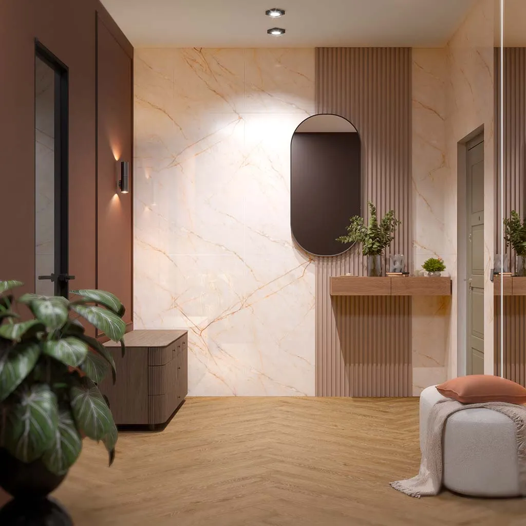 На поверхности плитки видны активные тёплые прожилки, эффект которых усиливается благодаря полированному покрытию. Сочетание бесконечного рисунка, полировки и классических оттенков выделяет коллекцию среди аналогов.