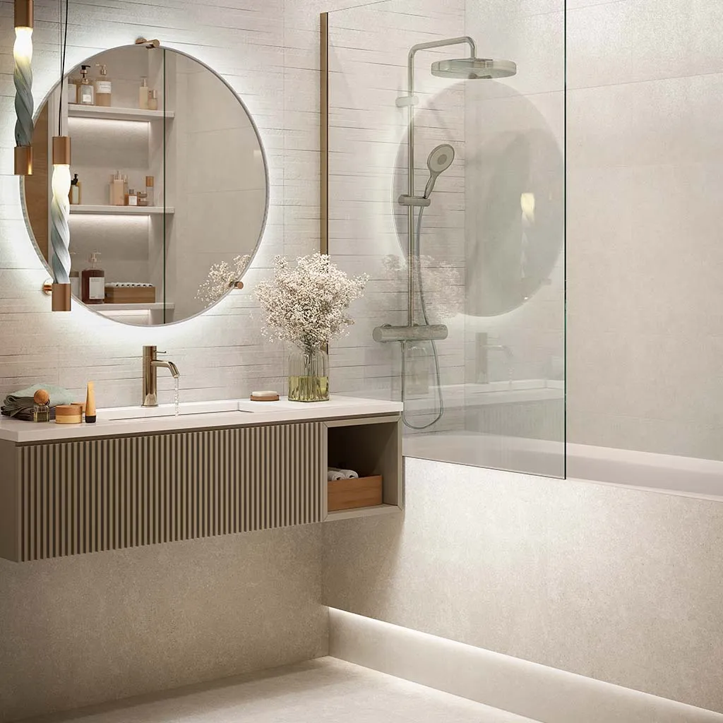 Плитка 30×90 см с sugar‑эффектом мягко мерцает, играя светом на неравномерном рельефе. Серо‑бежевые оттенки и фактурные декоры создают глубину и объём, превращая стену в утончённый элемент современного интерьера. Лофт без пафоса — только чистота линий и тактильная притягательность.
