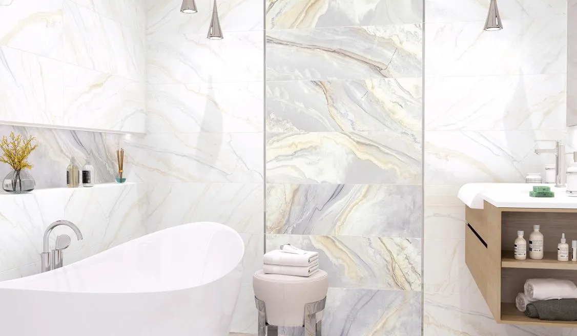 Маджик Альма Керамика - Коллекция плитки для ванной под мрамор с акцентными прожилками в разных цветовых решениях