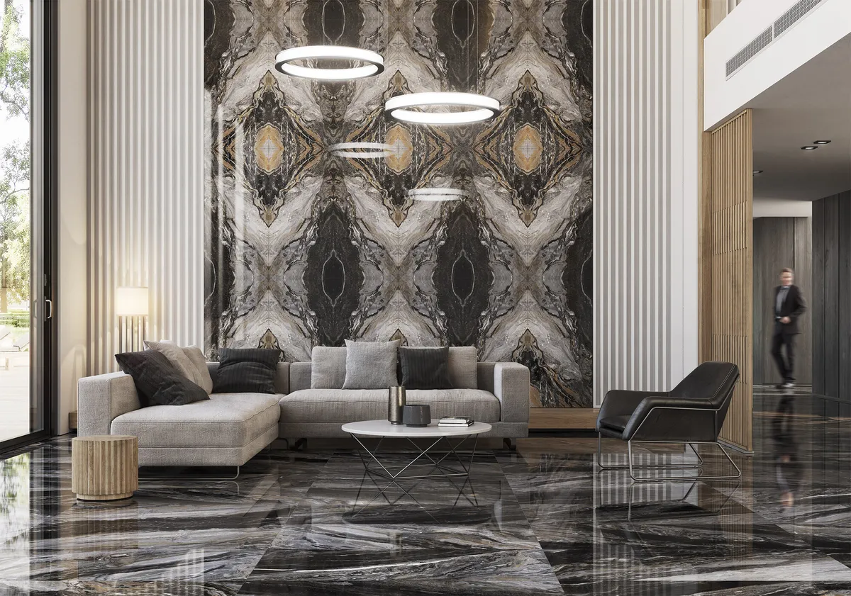 Основной цвет этого мрамора темно-серый или светло-серый с белыми и золотыми прожилками. Контрастные переходы цвета делают материал уникальным и стильным.