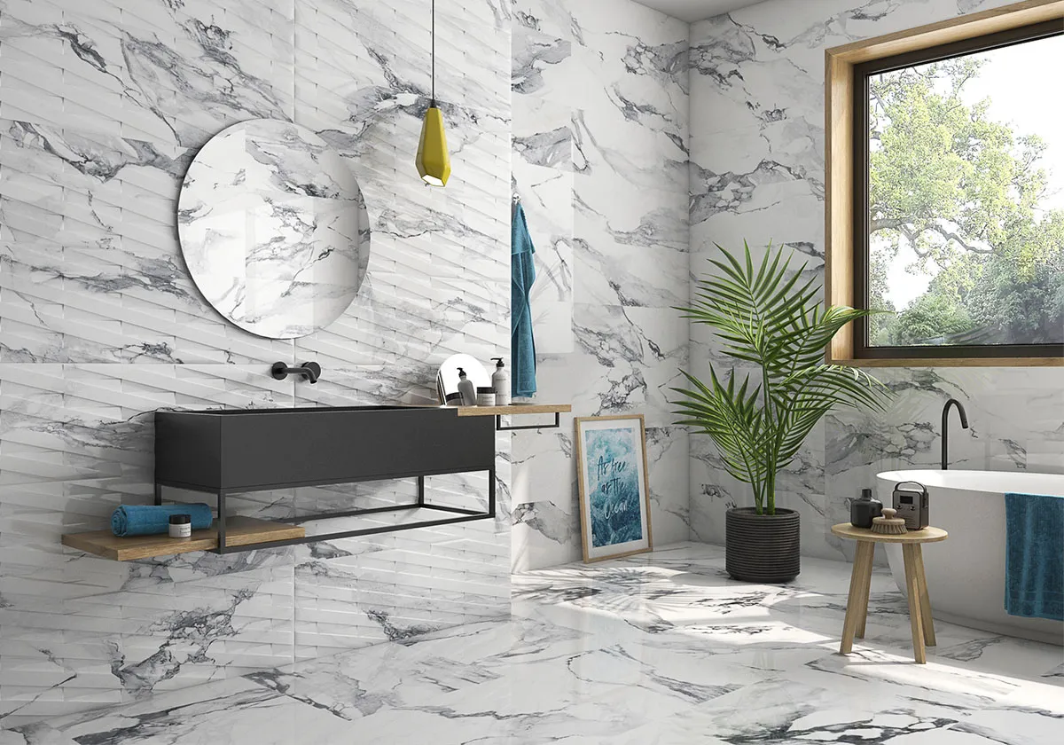 Высокая вариативность рисунка мрамора (12 "лиц" для настенной и 28 для керамогранита) позволяет делать реалистичные интерьеры.
