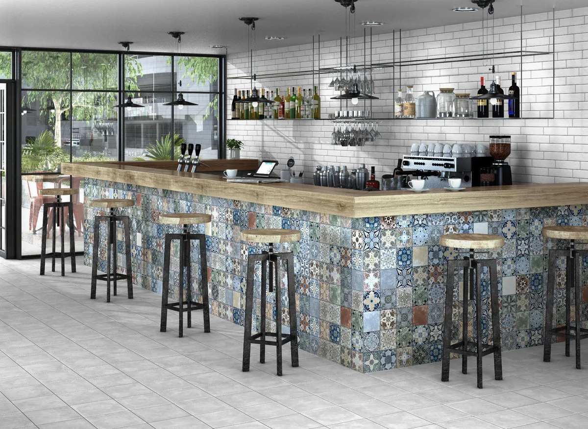 Коллекция плитки Ксерея от испанской фабрики Кодикер. Керамогранит в стеле пэчворк в яркой цветной и приглушенной черно-белой расцветке. Небольшая потертость придает стилю еще большую правдоподобность.